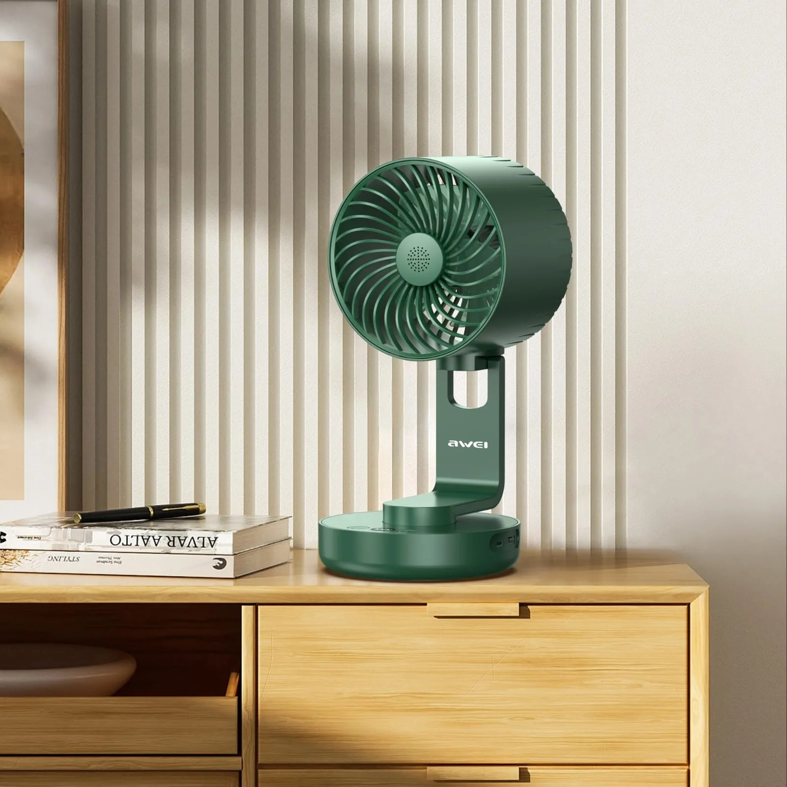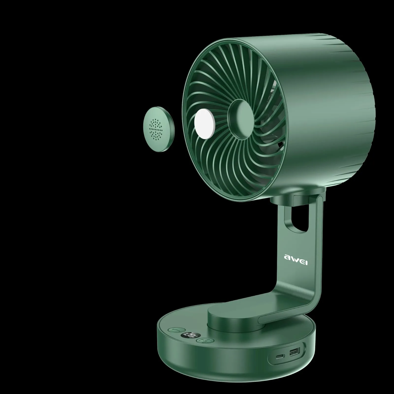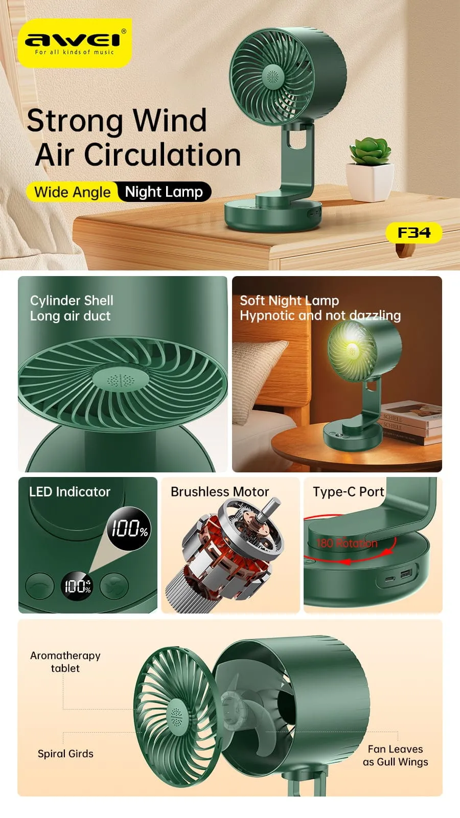 The Awei F34 Air Circulation Wide Angle Fan is a flexible and attractive cooling solution that improves both comfort and ambiance. Its distinctive cylinder shell holds a large air duct, resulting in wide-angle airflow that effectively circulates air around the room. The F34 fan has gull-wing-shaped fan blades that increase air flow while operating quietly owing to the energy-efficient brushless motor. This strong but silent motor provides a smooth, whisper-quiet performance that is ideal for any setting, whether at home or in the workplace. One of the most notable aspects of the Awei F34 is its soft night lighting, which generates a mild, hypnotic light that is easy on the eyes and ideal for creating a peaceful ambiance during the night without being too bright. The F34 fan also features an LED indication, which adds a modern touch and makes it simple to check settings. The Awei F34 fan has an aromatherapy tablet slot, allowing users to fill their surroundings with relaxing smells while enjoying the cooling wind. The Awei F34 fan is powered via a handy Type-C connector, which makes it compatible with contemporary charging devices and simple to recharge. With its elegant design, multi-functional functions, and wide-angle airflow, the Awei F34 not only cools the air but also adds soft lighting and aromatherapy to your living environment. It is an ideal balance of design, comfort, and functionality.