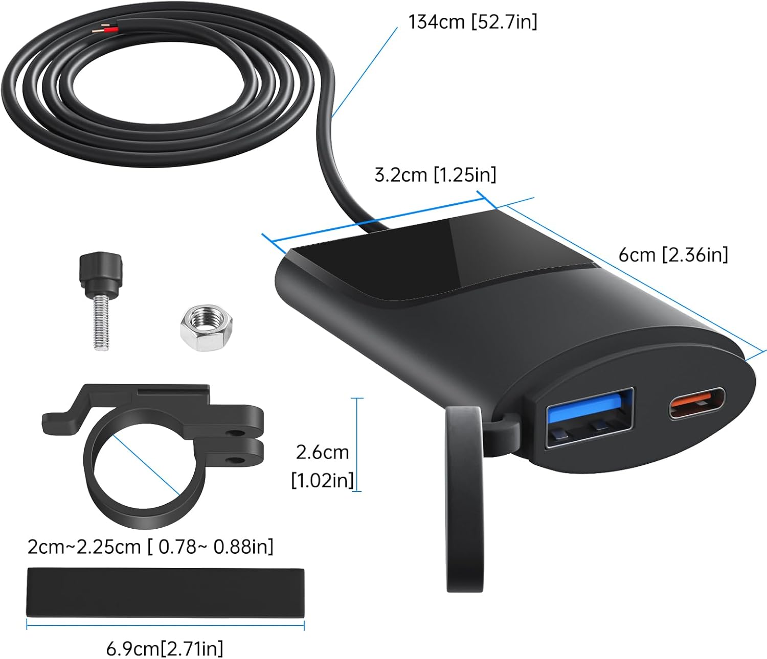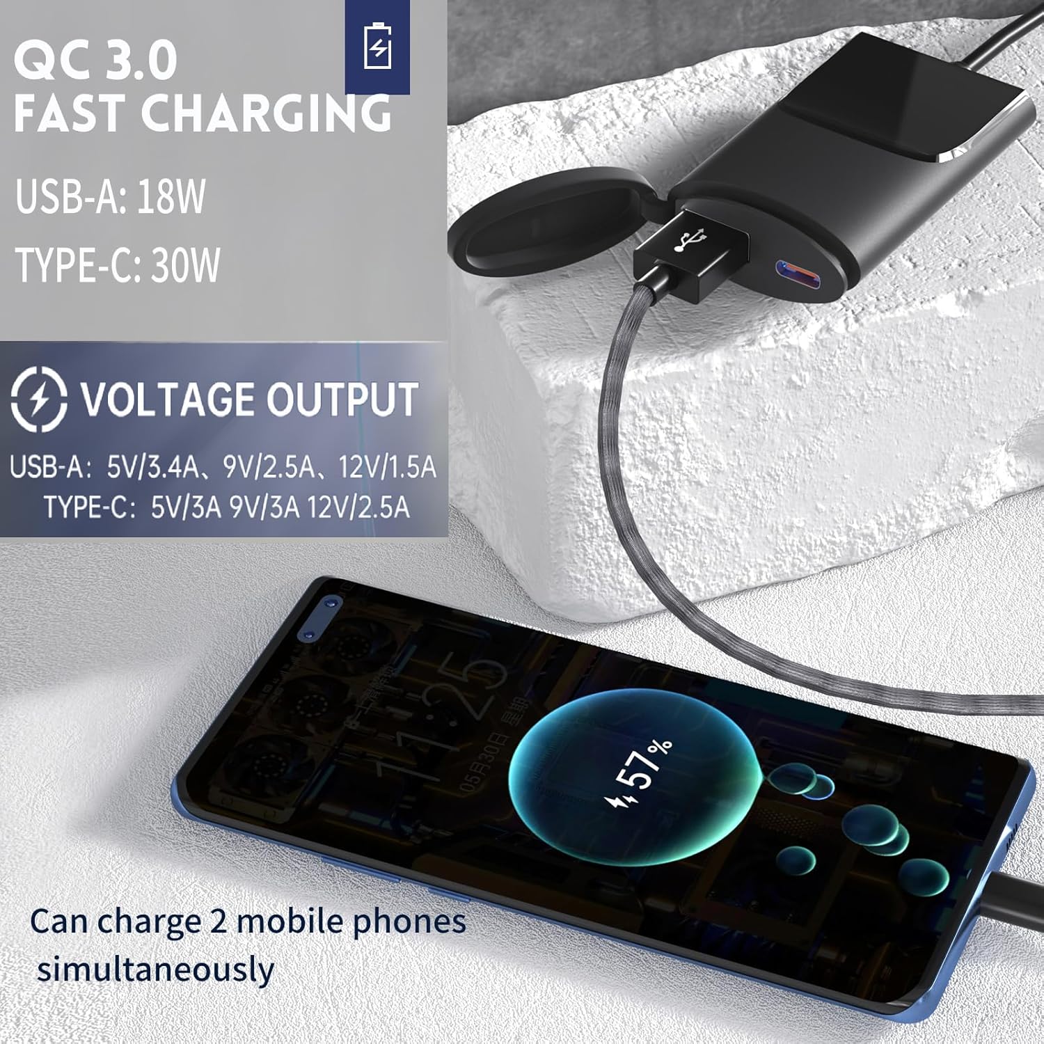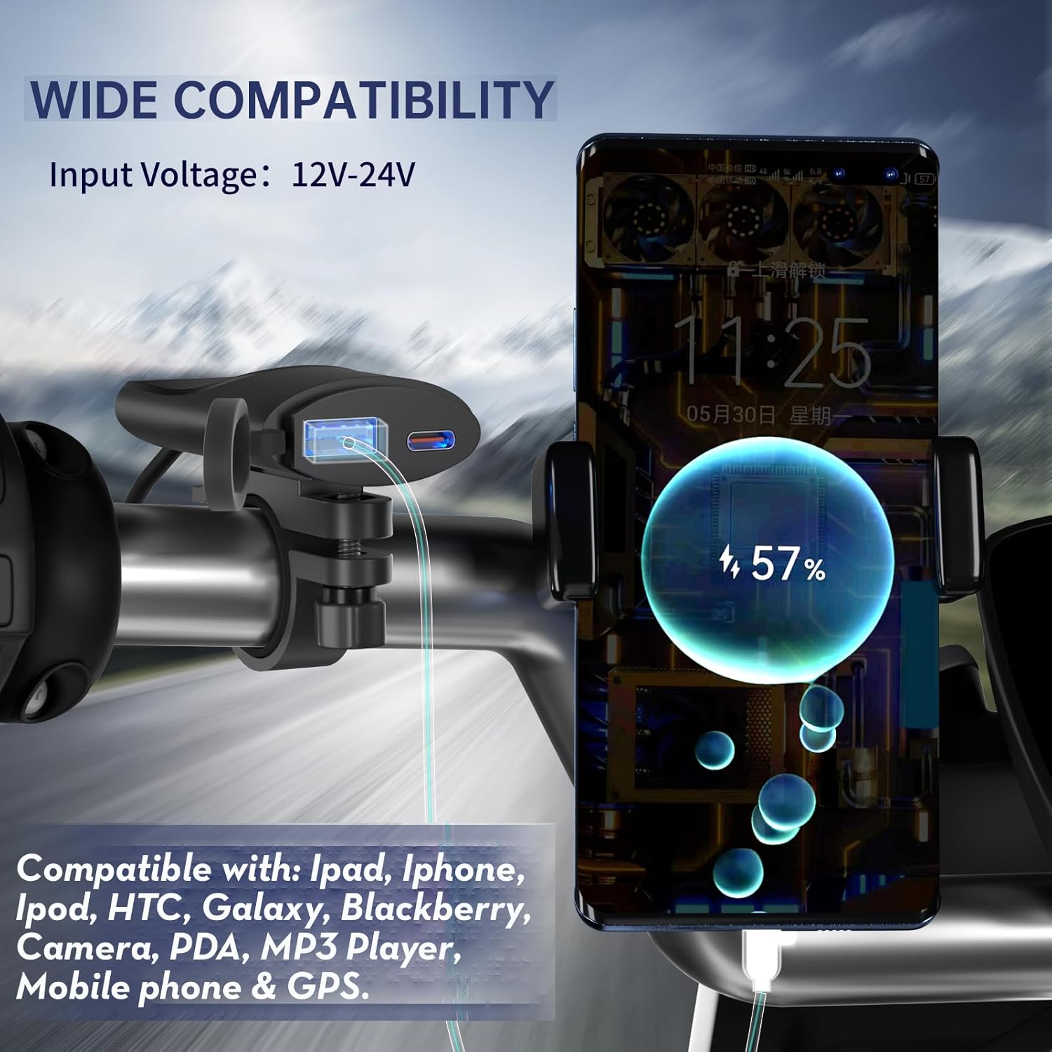 - WIDE COMPATIBILITY- Motorcycle USB charger input voltage is (12V-24V). It can automatically adjust the voltage output according to your device (USB-A: 5V/3.4A, 9V/2.5A, 12V/1.5A TYPE-C: 5V/3A 9V/3A 12V/2.5A), and is fully compatible with iPad, iPhone, iPod, HTC, Galaxy, BlackBerry, digital cameras, PDAs, MP3 players, cell phones and GPS.