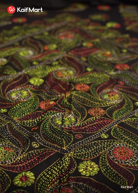 Bring home the elegance of Bangladeshi tradition with this Handmade Nakshi Bed Sheet. Beautifully hand-stitched on a rich black fabric, decorated with vibrant floral designs.