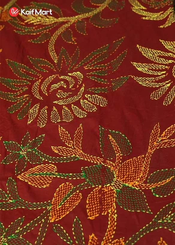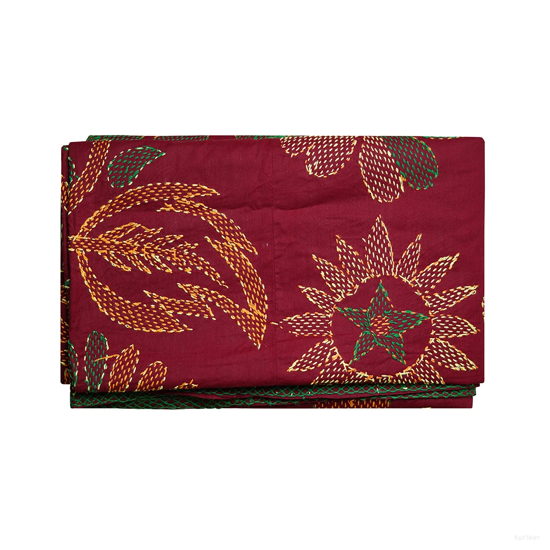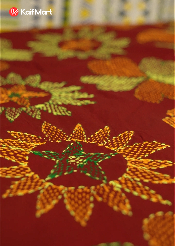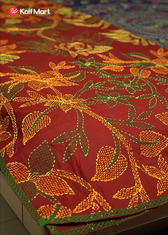 Bring home the elegance of Bangladeshi tradition with this Handmade Nakshi Katha. Beautifully hand-stitched on a rich red fabric, decorated with vibrant floral designs in yellow and green threads.