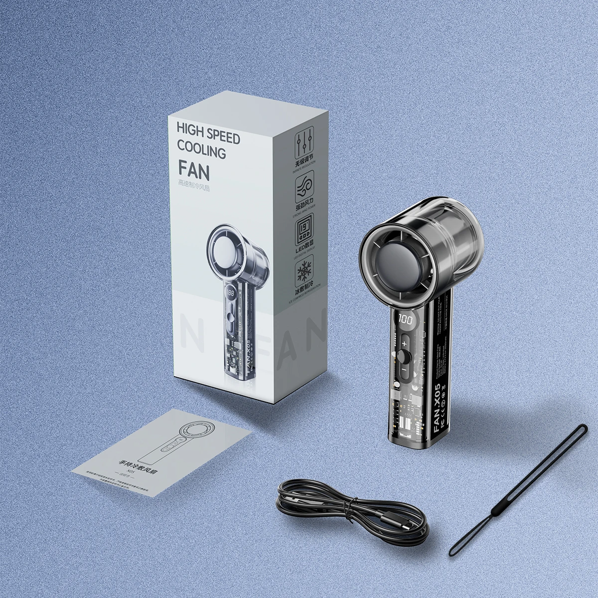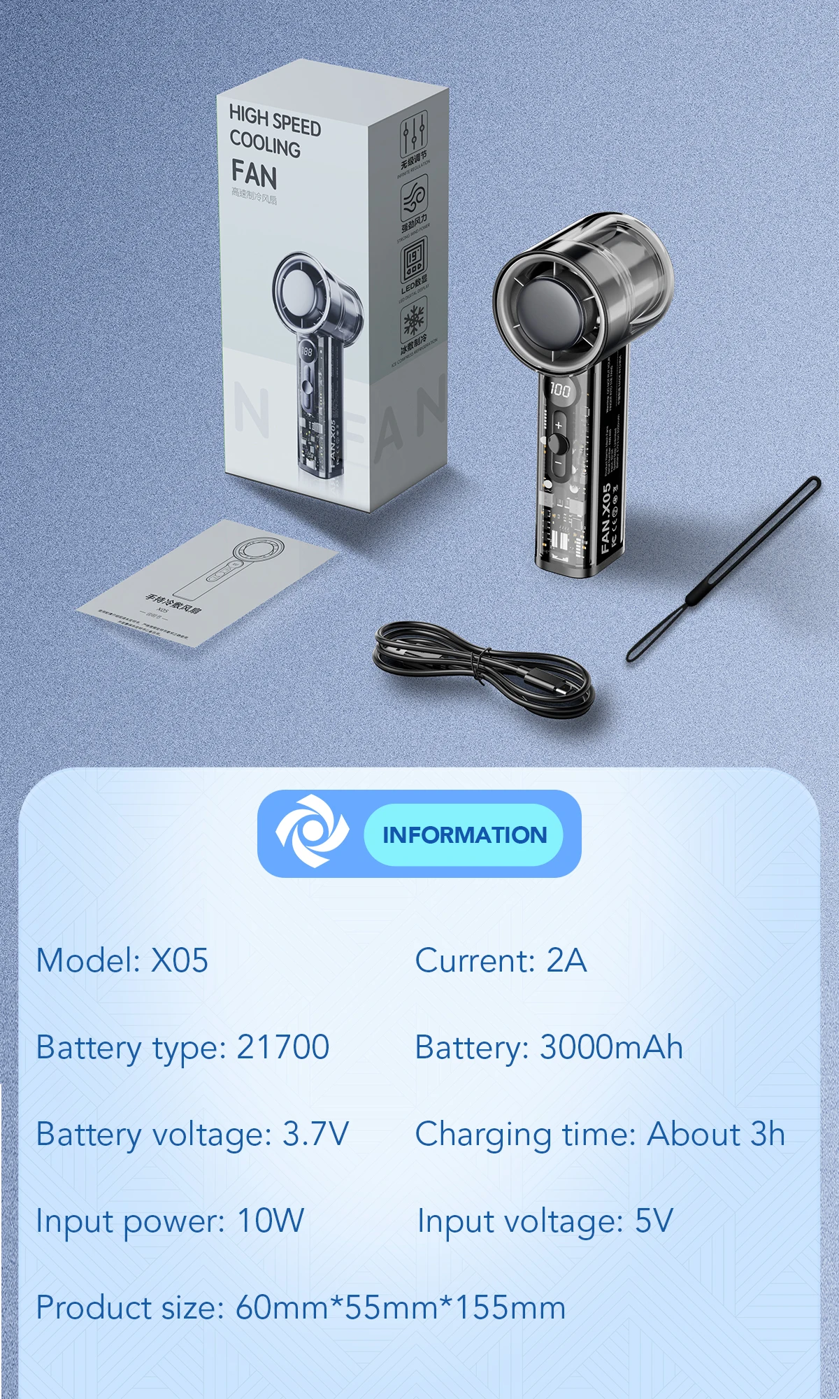 Measuring 60mm × 55mm × 155mm, the X05 fan is compact enough to fit in a backpack, handbag, or even be carried with its included strap. Despite its small size, the fan is built with durable materials, ensuring long-term use. It comes with a charging cable, user manual, and wrist strap for added convenience.